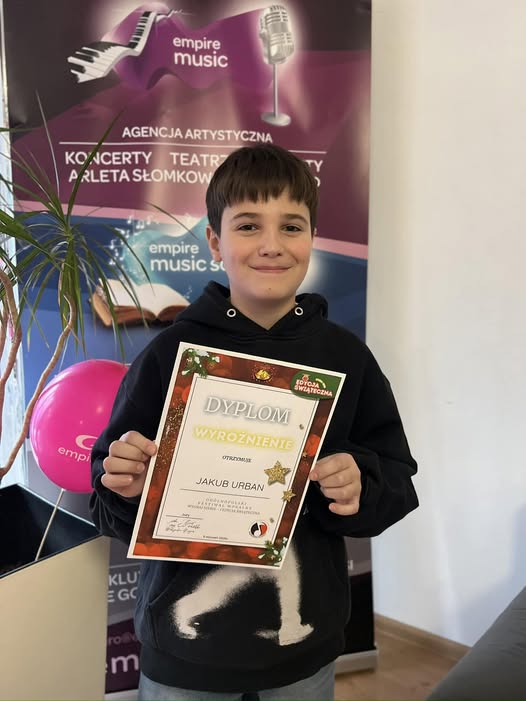 Z ogromną dumą dzielimy się kolejnym sukcesem naszego ucznia, Kuby Urbana, podopiecznego pani Arletki. Kuba został wyróżniony w ogólnopolskim konkursie wokalnym „Wygraj Siebie”, gdzie zaprezentował piosenkę „Jingle Bell Rock”. Jego występ przyciągnął uwagę jury w rywalizacji, w której udział brało kilkaset uczestników!